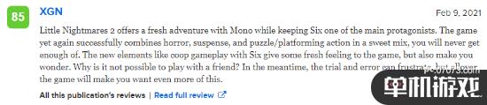 XGN为本作给出85分,表示:《小小梦魇2》提供了与Mono的全新冒险,同时保留了6个主角之一。这款游戏再次成功地将恐怖、悬念、谜题和平台动作结合在一起,你永远都不会满足。新元素,比如与6人合作的游戏玩法,给游戏带来一些新鲜的感觉。但也会让你好奇,为什么不能和朋友一起玩?与此同时,尝试和错误可能会让你受挫,但整个游戏都会让你想要体验更多内容。
