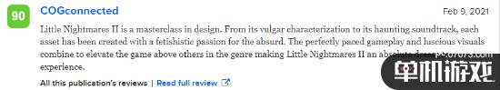COGconnected为本作给出90分,表示:《小小梦魇2》拥有大师级的设计。从低俗的人物塑造到令人难忘的配乐,都充斥着对荒诞的迷恋。完美的游戏节奏和优秀的视觉效果结合在一起,提供了高于同类游戏的体验,让游玩《小小梦魇2》成为梦境般的体验。