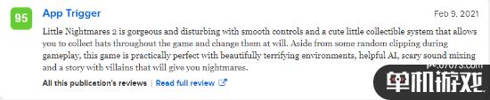 App Trigger为本作给出95分,表示:《小小梦魇2》华丽而令人不安,拥有流畅的控制和可爱的小收集系统,允许你在整个游戏过程中收集帽子并随意更改它们。这款游戏具有美丽的恐怖环境、有益的AI、恐怖的音效和一个会让你做噩梦的恶棍故事。