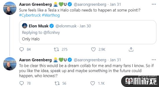 近日特斯拉公司CEO埃隆·马斯克在回答网友提问“你最爱什么主机游戏”时回答,“只有《光环》”。微软市场部总经理Aaron Greenberg对此表示:“特斯拉X《光环》可能会在未来开启联动!”他还在推文中打上了特斯拉的Cybertruck和《光环》中疣猪号的标签。