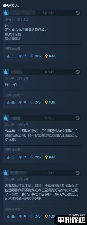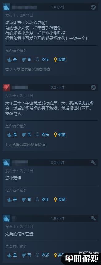 玩家测评大多对于这款游戏的氛围营造给予肯定,并且也对本作长于前作的流程和低于前作的价格非常满意。为数不多的差评是因为报错无法进入游戏之类的问题。