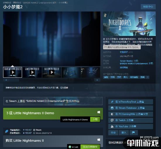 Tarshier工作室制作、万代南梦宫发行的悬疑恐怖游戏《小小梦魇2》已于今日正式发售,Steam首日特别好评(273),好评率91%。