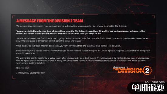 《全境封锁2》官方推特公布消息,本作在2021年仍会有新内容推出。