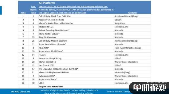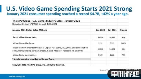 NPD公开了2021年1月美国游戏市场统计数据报告,1月游戏市场总销售额达47亿美元,同比增长42%。