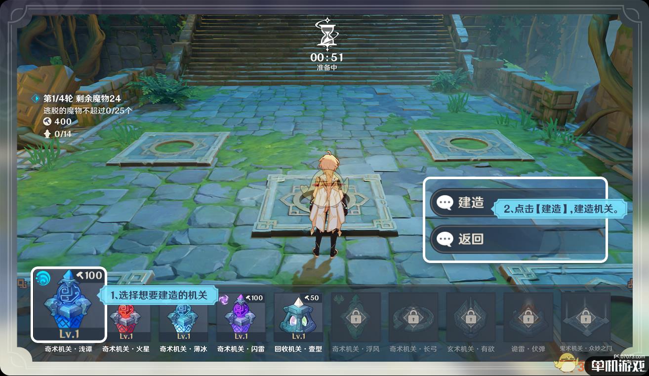 在建造阶段,界面上方会开启倒计时,旅行者们可以利用这段时间来规划战术,建造机关。此时本轮魔物的行进路线会在地面上预先指示。