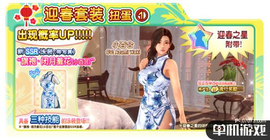 在“迎春套装扭蛋①”中,新SSR泳装“旗袍·闭月羞花(小百合)”是PICK UP泳装。