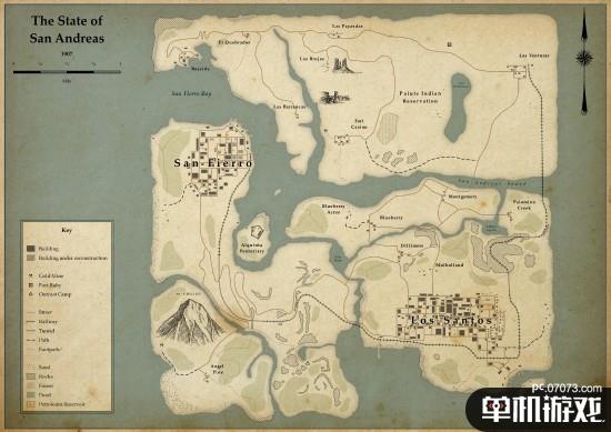 从这位网友绘制的地图上看,在他的想象中,1907年的圣安地列斯多地还尚未开发,铁路尚在逐步铺设,甚至还有几处金矿正在开采,原本圣安地列斯机场的位置则是一座监狱。