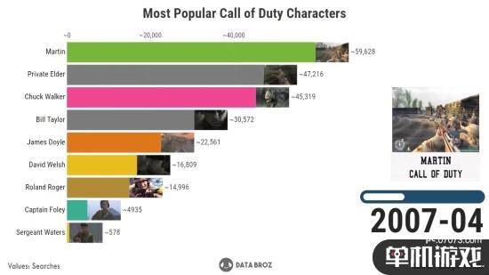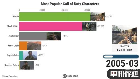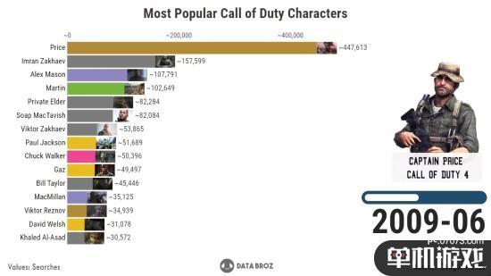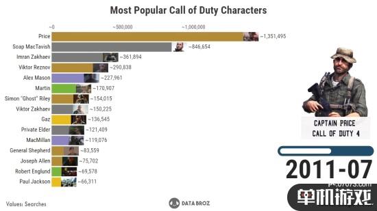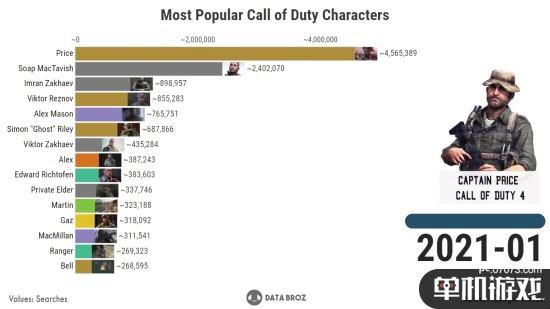 u/danipaul根据谷歌趋势对《使命召唤》系列十多年来(2005至2021年)的角色人气进行了可视化归类,从视频中来看,普莱斯自2007年初次登场以来其人气便一骑绝尘,老战友“肥皂”的人气等到2009年《现代战争2》推出之后也逐步追赶上来。从统计来看,这两位《现代战争》角色的人气恐怕是后来者们难以超越的了。