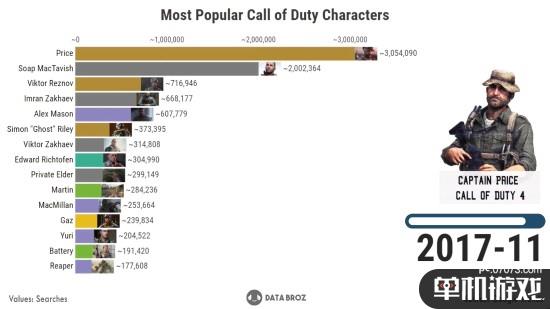 Reddit论坛用户u/danipaul近日发布了一段视频,展示了《使命召唤》系列十年来角色的人气变化,在十多年里无人能够撼动“钱队”普莱斯人气第一的位置。一起来看看网友统计的相关数据。