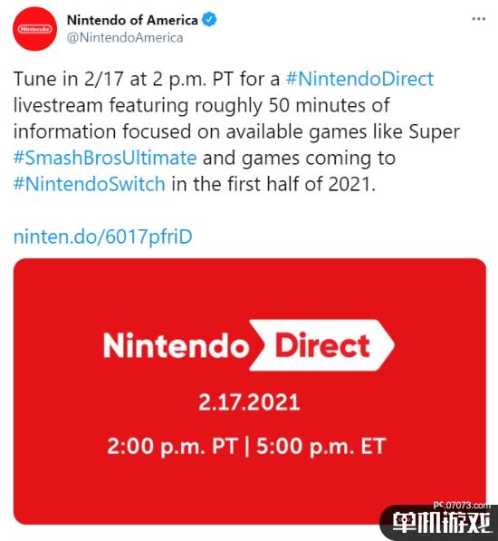 任天堂官推宣布将于2月18日早上6点举办任天堂直面会,时长50分钟,直面会内容包括《任天堂明星大乱斗特别版》的新情报,以及今年上半年Switch上的游戏阵容,感兴趣的玩家不要错过。