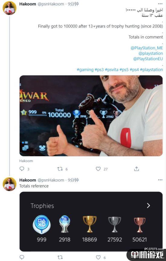 沙特肝帝Hankoom发推宣布历时13年,他的PS奖杯数量终于达到了10万个!这10万个奖杯包含2918个白金奖杯,18869个金杯,27592个银杯和50621个铜杯。