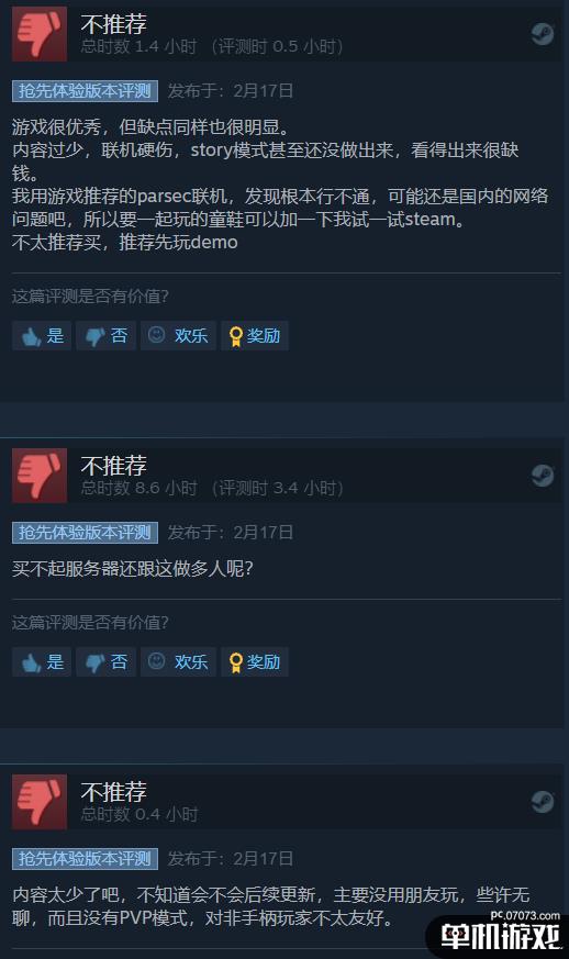 而给出差评的玩家,大多数并非对游戏玩法不满,而是吐槽目前游戏内容较少,且服务器联机机制较差造成体验不佳。由于本作还处于EA阶段,所以这些问题都有望之后得到解决。