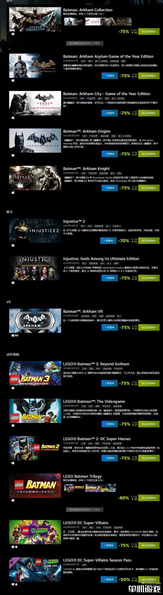 《蝙蝠侠阿卡姆》系列、《不义联盟》系列、《乐高蝙蝠侠》系列、《乐高DC超级反派》等等都在折扣中。