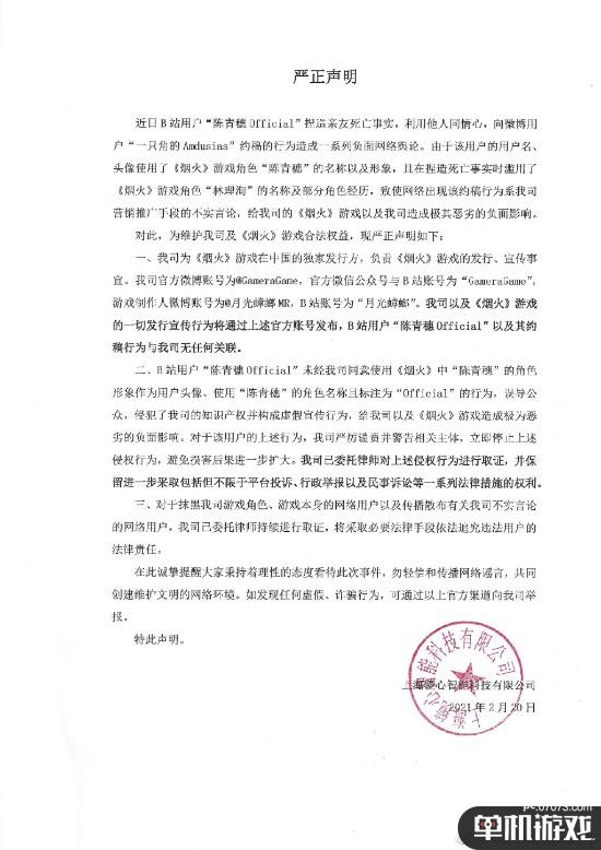针对此次恶劣事件官方做出声明:B站用户“陈青穗official”以及其约稿行为与公司无任何关联;将对此B站用户的侵权行为进行取证,保留进一步采取法律措施权利;对抹黑游戏角色、游戏本身,以及传播散布有关公司不实言论的网络用户,已委托律师持续进行取证,将采取法律手段追究法律责任。