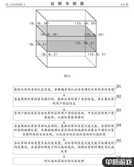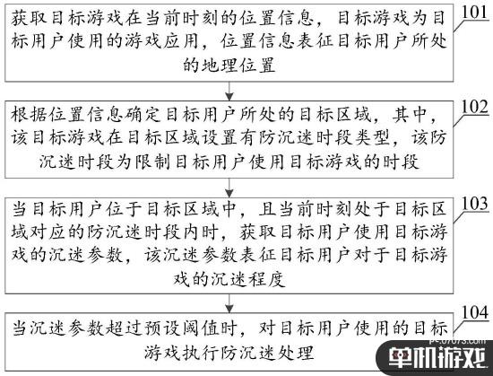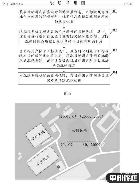 申请书也通过图例和详细的文字描述谈及了防沉迷的原理:“实施例公开了一种防沉迷方法、装置、服务器和存储介质;本发明实施例可获取目标游戏在当前时刻的位置信息,其中,目标游戏为目标用户使用的游戏应用,位置信息表征目标用户所处的地理位置;根据位置信息确定目标用户所处的目标区域,目标游戏在目标区域设置有防沉迷时段类型,该防沉迷时段为限制目标用户使用目标游戏的时段;当目标用户位于目标区域中,且当前时刻处于目标区域对应的防沉迷时段内时,获取目标用户使用目标游戏的沉迷参数,该沉迷参数表征目标用户对于目标游戏的沉迷程度;当沉迷参数超过预设阈值时,对目标用户使用的目标游戏执行防沉迷处理。由此,本方案可以提升区分沉迷用户的准确度,从而实现优秀的防沉迷效果。”