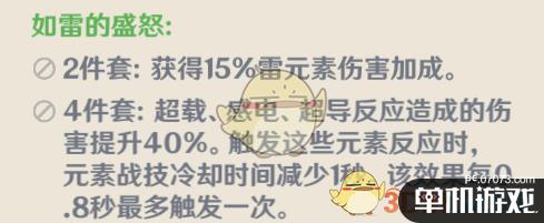 如雷的盛怒套装(雷伤套)在1.0版本得到了加强,四件套对三类剧变反应的伤害加成由25%→40%;冷却时间减少1秒的效果触发间隔也由1秒→0.8秒。