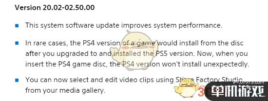索尼将这次更新问题描述为:“有时在将PS4游戏光盘升级到并安装PS5版本之后,还会从PS4光盘上安装PS4版本游戏。现在,当您插入PS4游戏光盘时,不会意外安装PS4版本”。除此之外,本次更新也将有助于提高“系统性能”,并允许玩家使用Share Factory Studio从媒体图库中选择和编辑视频剪辑。