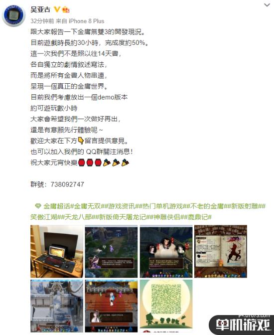 同人游戏《金庸无双》制作人@吴亚古今天通过微博分享了《金庸无双3》的开放状况,制作人表示,本作目前的开发完成度约50%。