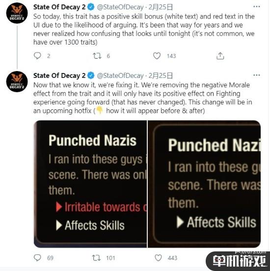 游戏团队表示,他们将会修复这个问题,在更新后他们会移除这个特质的负面效果,让“痛揍纳粹”只具有格斗经验的正面效果。
