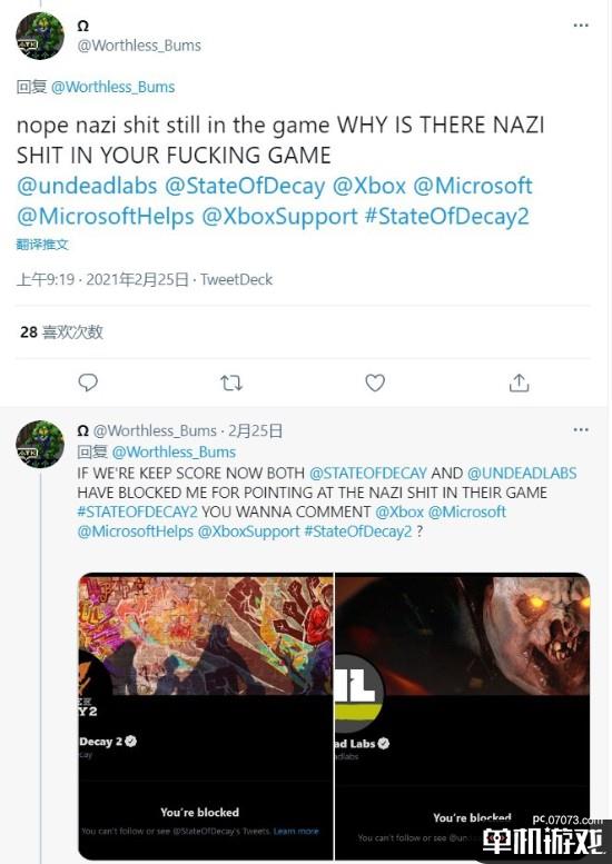 而据James Seow描述,他去质问过开发者Undead Labs和《腐烂国度》官推,为何他们的游戏里存在这样的“纳粹狗屎”,但Seow遭到了两个推特账号的拉黑——这样一来,就让人感觉开发商正在刻意压制某些言论了。