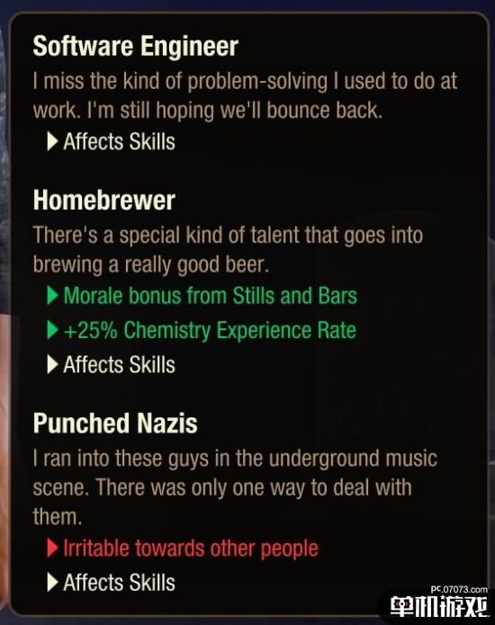 “它被设计为一个整体上积极的特质,有一个技能加成——能给该角色四星的格斗经验,还能让该角色为自己的信仰进行激情争辩(我们认为能在混战中痛揍纳粹的人,往往都是情感强烈的)。”Undead Labs解释说。
