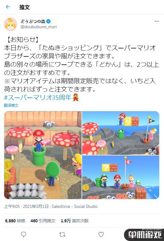 《动森》×《马里奥》的联动道具已经上线,玩家可以在“狸猫购物”处订购马里奥的服装和家居,并且可以在安装的水管之间跳跃。