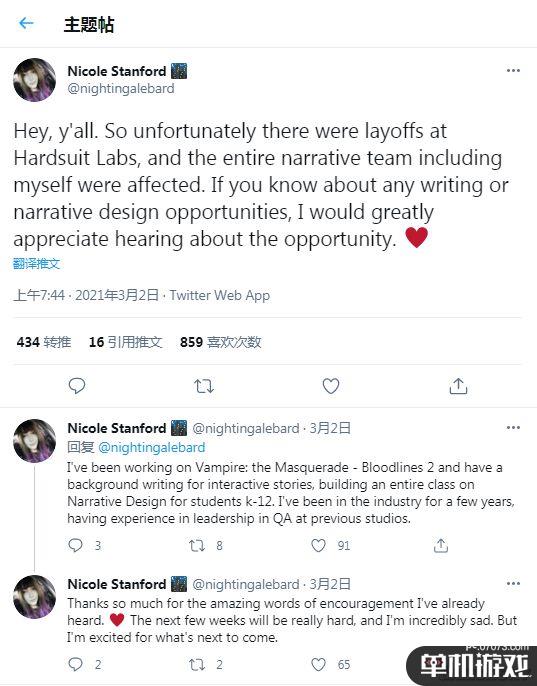据前Hardsuit的叙事设计师——Nicole Stanford的推特内容,本次裁员对叙事部门的影响很大。