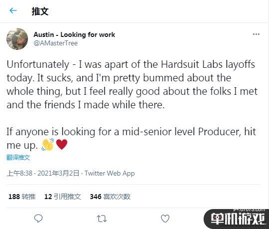 随后不久,前Hardsuit的制作人Austin也发推表示自己离职了,看来这次裁员不限于叙事团队,是全公司范围的。