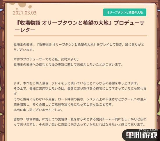 《牧场物语:橄榄镇与希望的大地》在发售之后出现了许多问题,比如读取时间过长、对话内容千篇一律以及BUG过多等等,今日游戏制作人武村大在游戏官方网站就游戏质量未达到玩家预期一事发布致歉公告,并宣布将于3月中旬推出更新补丁,改进游戏体验。