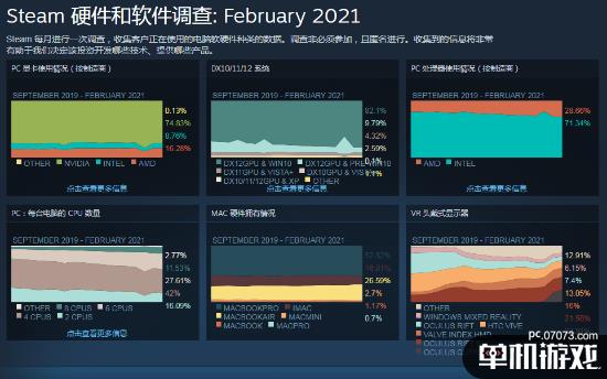 Steam公布了2021年2月的用户硬件调查结果,我们现总结如下(数据来自于所有Steam调查受访用户):
