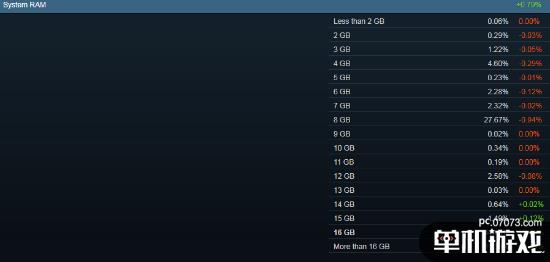 16GB的内存已经成为近半数玩家的标配,超过44%的玩家选择了这一配置,紧随其后的则是8GB内存和高于16GB内存的玩家,占比分别为27.67%和11.39%。