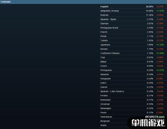 用户语言方面,英语用户占比来到了38.8%,较上个月减少了0.51%;简中用户仍然是第二大用户群体,玩家占比19.8%,较上个月提高了1.87%。
