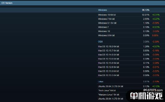 系统方面,64位Win10系统的用户使用率达到了92.01%。现在,仅有不足10%的Steam用户仍在使用包括Win7、Win8等旧系统。