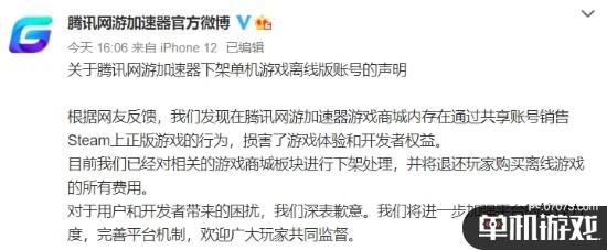 今日腾讯网游加速器官方微博发布声明,表示已经对相关的游戏商城板块进行下架处理,并将退还玩家购买离线游戏的所有费用。