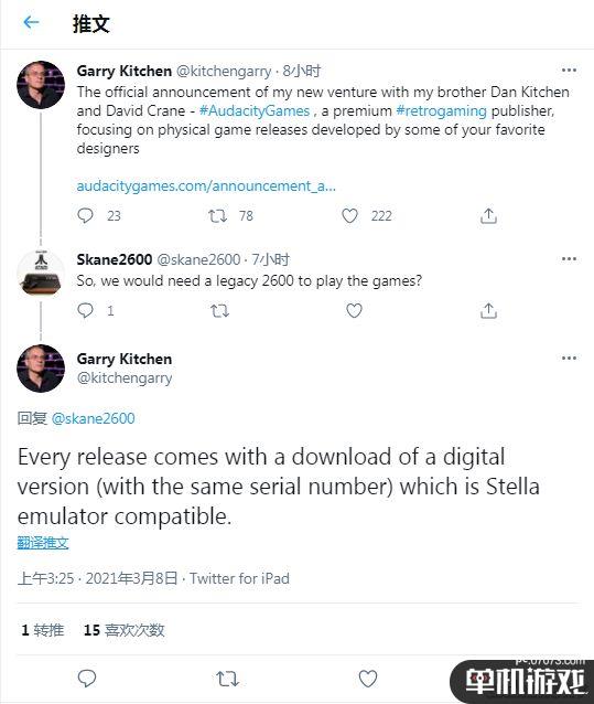 Garry还在推特上补充,如果玩家们无法获得那些经典游戏硬件,他们会在游戏产品中附加一个可以在Stella和Retron上使用的下载码。