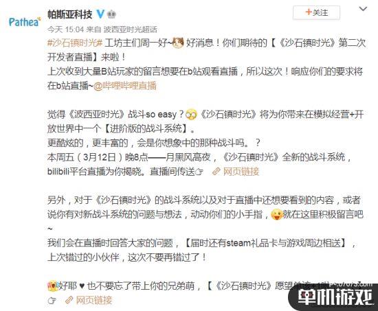 今日帕斯亚科技官博宣布将于3月12日(本周五)晚8点在B站举行《沙石镇时光》第二次开发者直播,介绍《沙石镇时光》的全新战斗系统,感兴趣的玩家可以去关注一下。