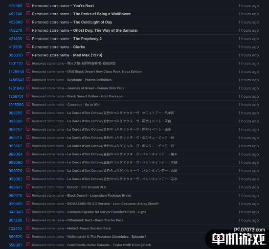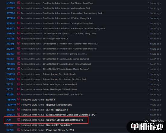 此外根据SteamDB的历史记录,V社在一个小时前一次性移除了数十个商店名字,其中包含《CS:GO》和《雀魂麻将》等,不过根据玩家反映,《CS:GO》和《雀魂麻将》仍能正常游玩,目前只是商店页面无法打开。