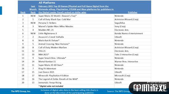 NPD美国2月市场报告:游戏软件方面单月销量中新晋三款作品《超级马里奥3D世界+狂怒世界》销量排名第一,《P5S》第三,《小小梦魇2》排第五。
