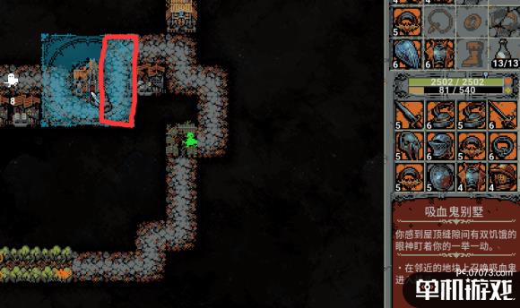 5、再在旁边摆上吸血鬼小屋。划红线的区域就会刷术士,一个拿书的女吸血鬼。