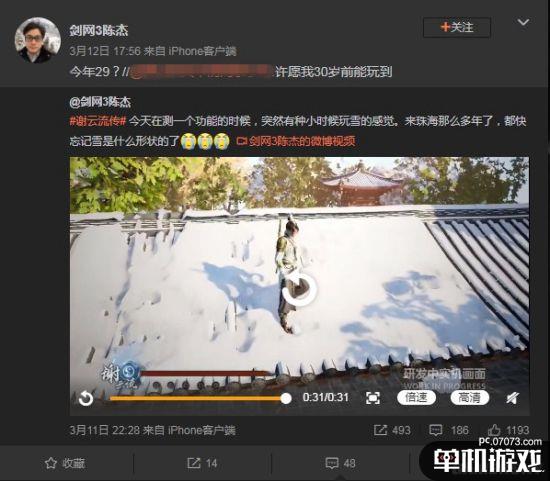 《剑侠情缘之谢云流传》的开发人员陈杰前几日展示了一段雪地效果演示。