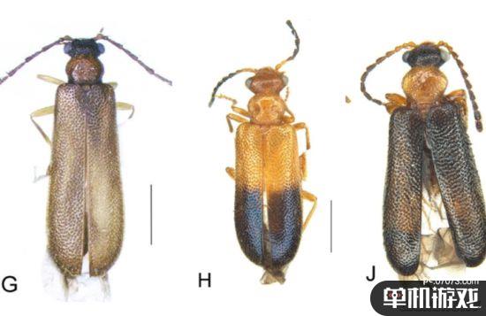 被取名为Articuno的甲虫(最左边)身体和翅膀都是银褐色的;被取名为Moltres的甲虫(中间)是一半景色一半黑色的;被取名为Zapdos的甲虫(最右边)翅膀和头是黑色的中间的躯体部分却是金色。