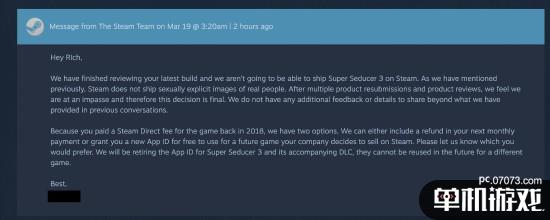 在此之前,Richard曾就此事与V社进行过沟通,并承诺会将游戏中出现的不合规的图片等内容删除:“请给我们个机会。”但V社方面的态度非常强硬:“我们不会发售发售该作品,也不会再度对该作品进行审查。”