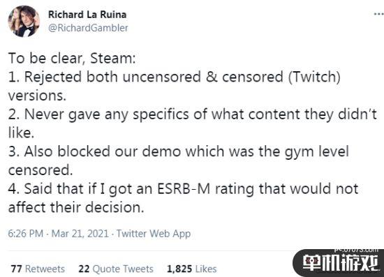 开发者Richard La Ruina近日在推特上表示:“说实在的,Steam拒绝了我们的完整版游戏和删减版(主播专用)游戏、从未向我们透露过他们不喜欢什么内容、甚至下架了我们的游戏Demo。同时Steam还表示就算我得到了ESRB“M”的评级,也不会影响他们的决定。”