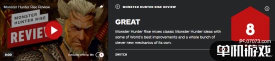 IGN评测者为《怪物猎人:崛起》打出了8分评价,评测者称赞了卡普空在本作中所加入的全新机制,IGN认为它们与《怪物猎人》本身的传统构想结合的很好。但评测者也表示本作在通关后的终局游戏内容稍显不足。