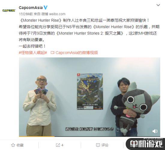 希望各位能充分享受现已于NS平台发售的《Monster Hunter Rise》的乐趣,并期待将于7月9日发售的《Monster Hunter Stories 2: 毁灭之翼》,这2款MH游戏还将有联动要素。