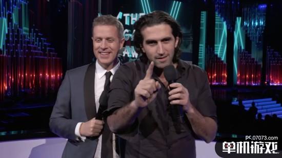 2017年TGA现场,痛骂奥斯卡的Josef Fares(右)与TGA创办人、主持人Geoff Keighley(左)