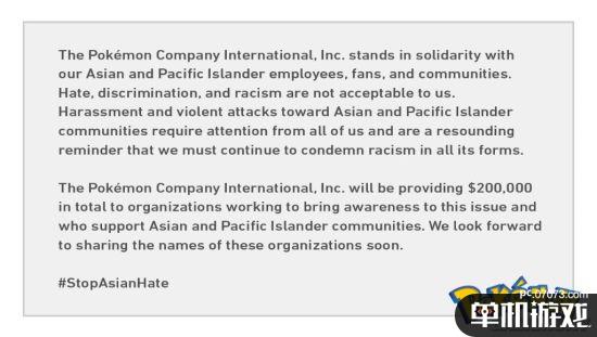 宝可梦公司将向致力于提高这一问题关注度的组织和支持亚裔太平洋联盟的组织提供总计20万美元的捐款。我们期待着尽快分享这些组织的名字。