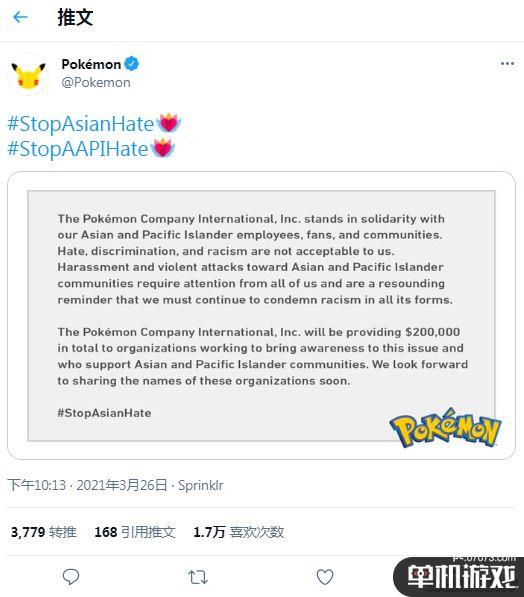 宝可梦官方推特刚刚发布了一则公告,宣布宝可梦公司将捐赠20万美元资助受歧视的亚裔社区,并呼吁停止仇恨亚裔。