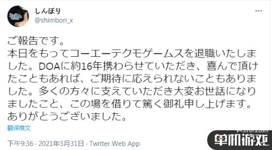 我今天正式从光荣特库摩离职了,我参与《DOA(死或生)》项目已经有16年之久,尽管有的时候作品并没有达到我的期望,但我仍然感到满意。我想借此机会向许多一直支持着我们的人表示由衷的感谢。