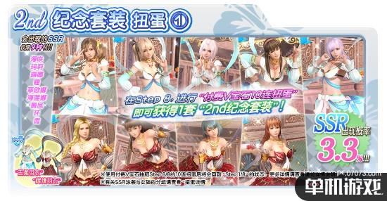 「2周年纪念活动」中的期间限定登入奖励,最多可获得7张「2nd纪念10连抽卡券」。同时,「2nd 纪念穿搭抽卡」的 SSR 出现机率为通常维纳斯抽卡的3倍,阶段 8/8 的付费 10 连抽卡中,确定可获得1套新 SSR 泳装「玉柔羽衣」「辉煌羽衣」。